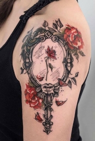女生手臂镜子与玫瑰纹身图案
