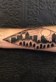 男生小手臂上黑灰纹身松树图案和建筑物图