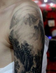 手臂经典的山水画纹身图片