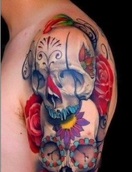 纹身520图库推荐一幅大臂骷髅头玫瑰花纹身图片