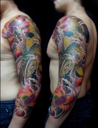 男士手臂外侧彩色鲤鱼花臂纹身图案