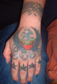 手部彩色非常小的爱心纹身图案