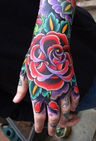 手部彩色传统风格的玫瑰花纹身图案