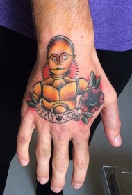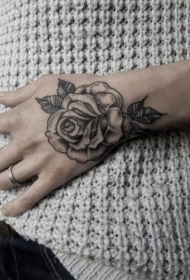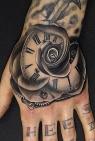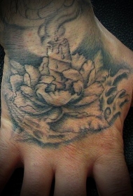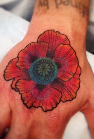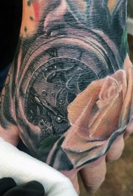 手背彩色逼真的花朵与蜜蜂纹身图案