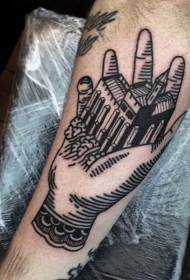 手臂可爱的小棺材与骷髅手黄玫瑰纹身图案