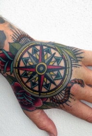 手背old school彩色罗盘和红玫瑰纹身图案