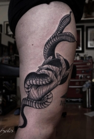 old school大腿雕刻风格黑色蛇与人的手纹身图案
