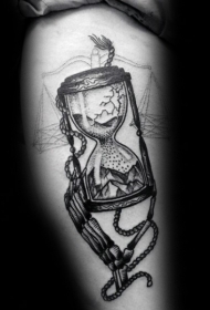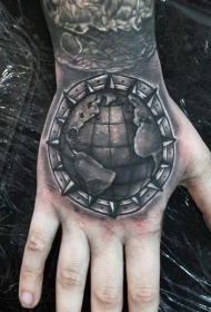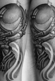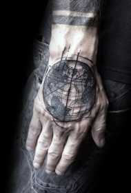 小臂黑色线条点刺骷髅手与行星纹身图案
