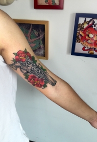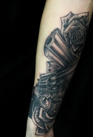 手臂扑克牌与手枪玫瑰个性纹身图案