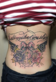 女生腰部漂亮的玫瑰手枪和字母纹身图案