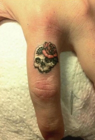 手指戴花朵的骷髅纹身图案