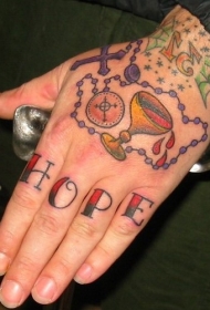 手背十字架项链酒杯和手指字母纹身图案