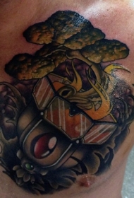 插画风格的小鸟和树屋彩色手臂纹身图案