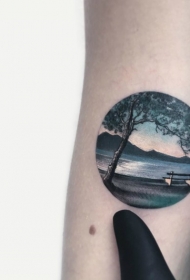 小圆圈里的彩绘湖边风景手臂纹身图案