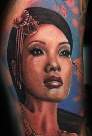 彩色日本女性肖像与樱花树手臂纹身图案