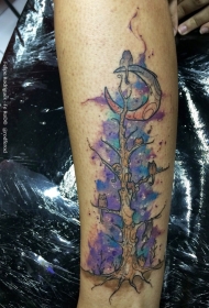 手臂彩色受伤的鸟和树枝纹身图案