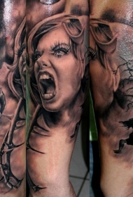 令人毛骨悚然的尖叫女人与黑暗树手臂纹身图案