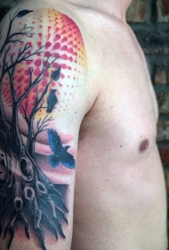 手臂黑色大树与乌鸦和彩色圆点纹身图案