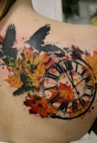 背部彩色的枫叶乌鸦和时钟纹身图案