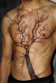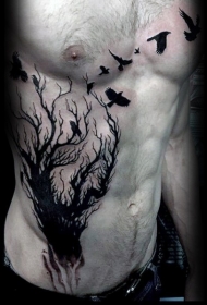 胸部亚洲风格的红太阳和黑色树小鸟纹身图案