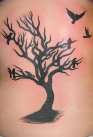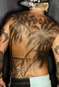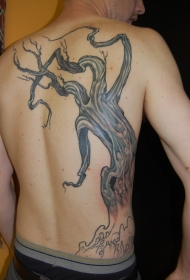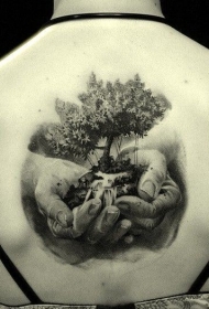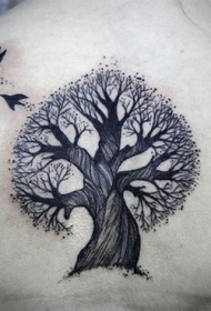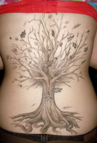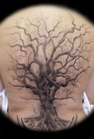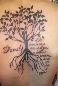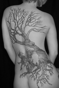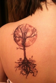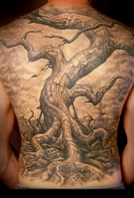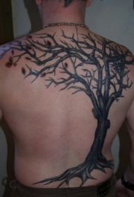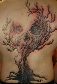 背部奇妙的黑色与红色大树叶子心脏纹身图案