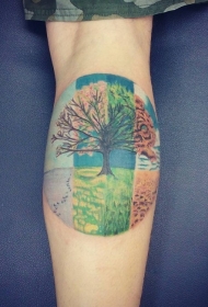 小腿彩绘海滩日落与棕榈树和花朵纹身图案