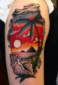 华丽好看的彩色日落与船和棕榈树纹身图案