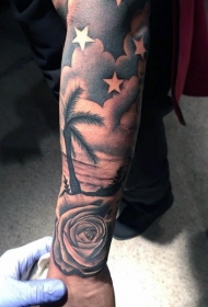 手臂美丽的手绘黑色棕榈树与夜空纹身图案
