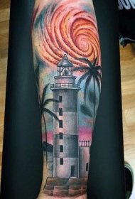 小臂美丽的彩色灯塔与棕榈树纹身图案