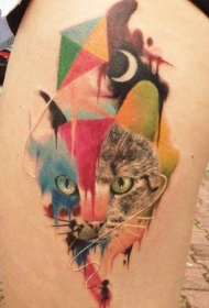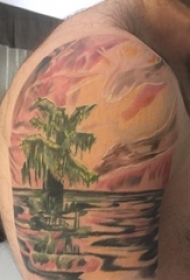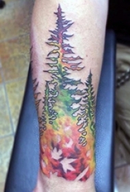 男生手臂上彩绘渐变抽象线条树和山水风景纹身图片