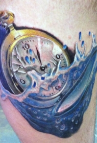 腿部彩色破碎的水下时钟纹身图片
