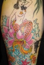 腿部彩色美人鱼与水百合纹身图案