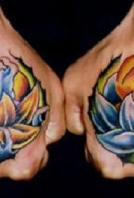 两只手背不同的莲花火焰水彩色纹身图案