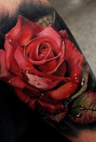 手臂令人惊叹的非常逼真天然彩色玫瑰与水滴纹身图案