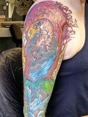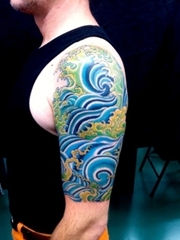 彩色DNA符号和蓝色水花船锚手臂纹身图案