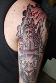 男生手臂上彩绘水彩素描创意城堡纹身图片