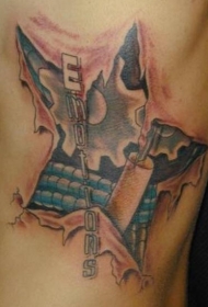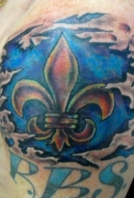 肩部蓝色背景百合花纹章撕皮纹身图案