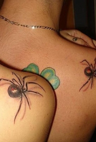 肩部逼真3D蜘蛛和绿色三叶草纹身图案