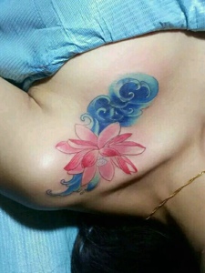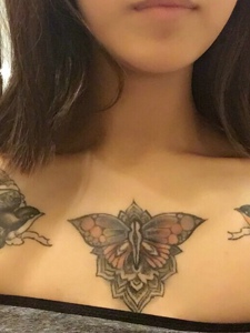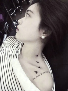 锁骨边上的水彩蓝色蝴蝶纹身图案