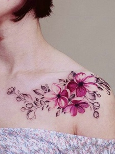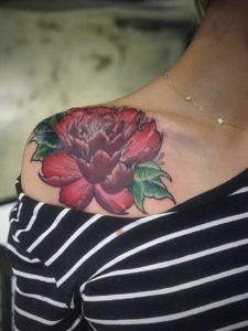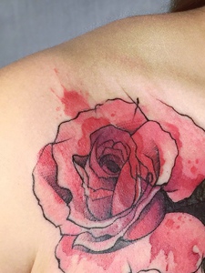 锁骨处的性感红玫瑰纹身刺青很夺眼