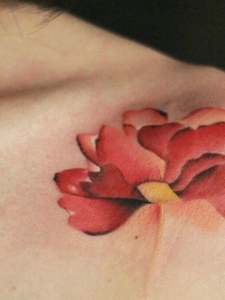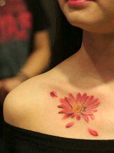 性感女神锁骨下一朵水彩花朵纹身刺青