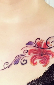 女生锁骨处鲜艳美丽的莲花纹身图案