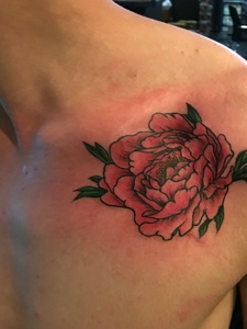 男士锁骨处一朵大红牡丹花纹身图案