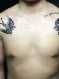 落在男士锁骨两边的小鸟纹身图案