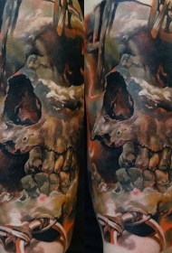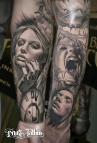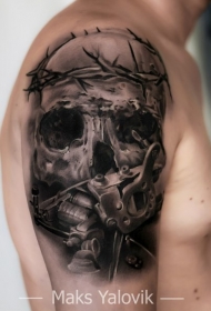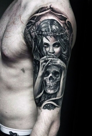 雕刻风格黑白肩膀妇女骷髅纹身图片