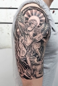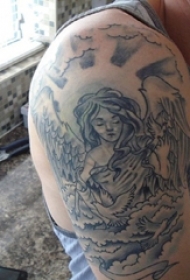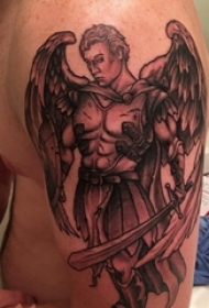 纹身守护天使 男生大臂上黑色的天寺纹身图片