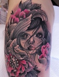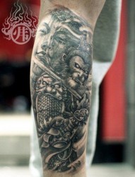 纹身馆推荐一款腿部黑灰艺妓纹身图案