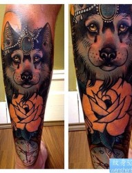 腿部个性彩色狗狗纹身图案