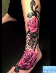 腿部玫瑰花蕾丝纹身图案