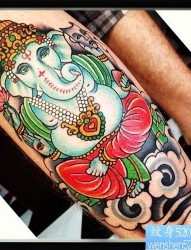 一款腿部彩色象神纹身图案